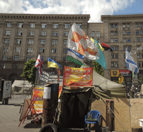 4月にキエフに行ったとき 2月のクーデターの痕跡が残っていたのは 独立広場の一角だけでした。 独立広場の地下にある ショッピングモールの入り口の 地下への階段を下りていくと 汚物の臭いがします。 そういえば バリケードで封鎖した大通りの一帯で トイレらしきものは 地下街に入らないとありません。 でも、そこは有料トイレです。 ここにずっと住んでいる迷彩服の人たちは この辺りの地下歩道で用を足しているのでしょうか。 とにかく 地上は テントの中で薪を焚いている煙で匂うし 地下道は トイレ臭くて キエフで1・2位を争うキレイだったショッピングモールは 残念な姿になってしまっていました。 その影響か 地下街のテナントも 空いているスペースがあったり ショッピング街やフードコートでも 以前よりはお客さんの数が減っていました。 そして 5月に再びキエフに行くと ようやく緑色の移動式簡易トイレが バリケード内に設置されていました。 なんと11月から始まった騒動 それに続くクーデター後 実に半年以上を経ての トイレ設置でした。 写真からもわかるように 4月までのバリケードの様子は タイヤや土のう、敷石が乱雑に積み上げられていましたが 5月には それらは片付けられ それなりに秩序が回復してきている印象です。 でも、道路は封鎖されており 迷彩服を着た人たちが テントを張り 相変わらず独立広場を占拠している状態は 変わりません。 それは大統領選挙が終わって 新政権が出来てからも同じ状態のままです。 2014,7,20 |